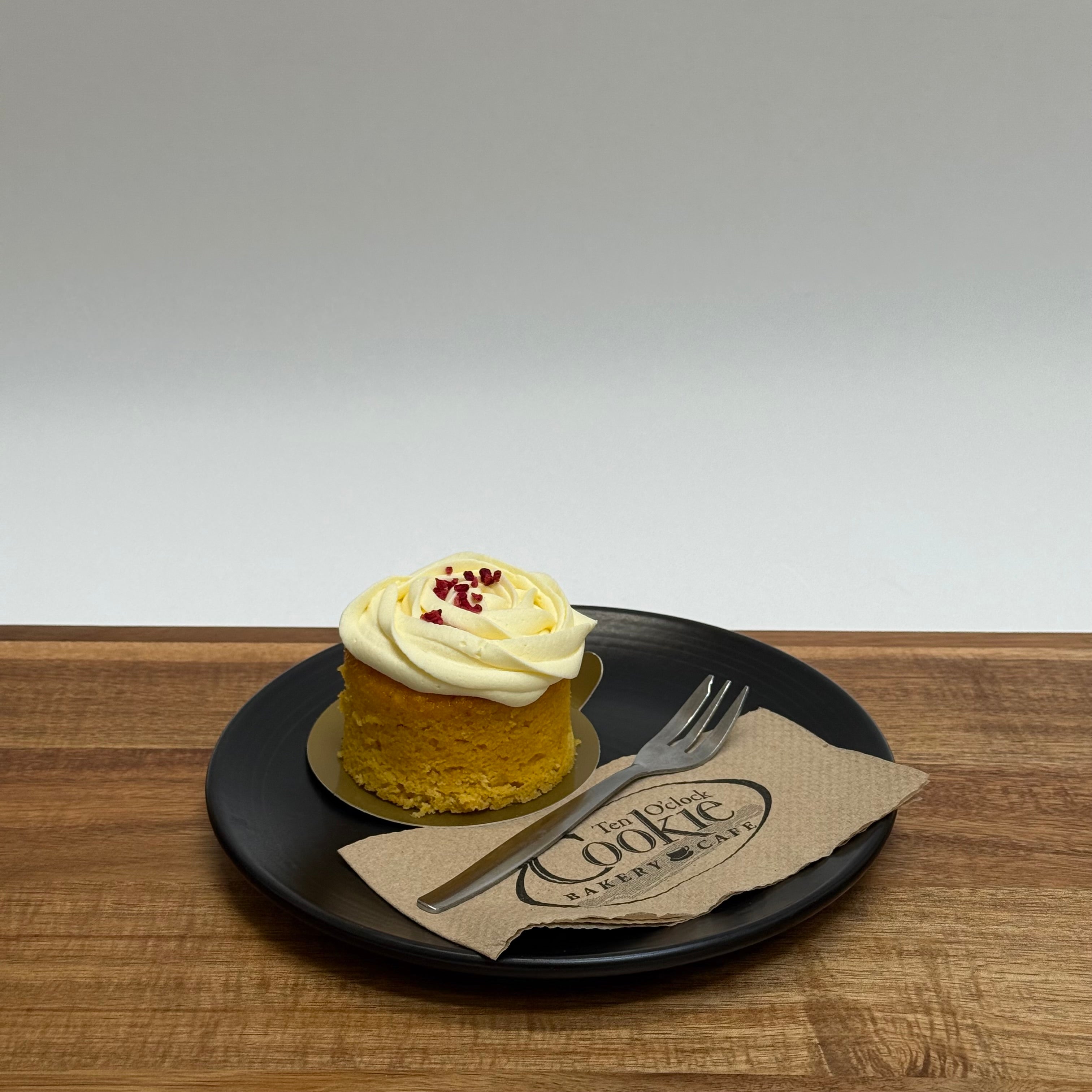 Indulge your sweet tooth with a beloved bakery favourite: the Petite Frosted Orange and Almond cake! Zesty, fresh and creamy flourless orange cake topped with cream cheese frosting and freeze-dried raspberries for an impressive treat that won't disappoint. Made with whole oranges for a robust, natural flavour, this single-serve cake will tempt your taste buds without the guilt.