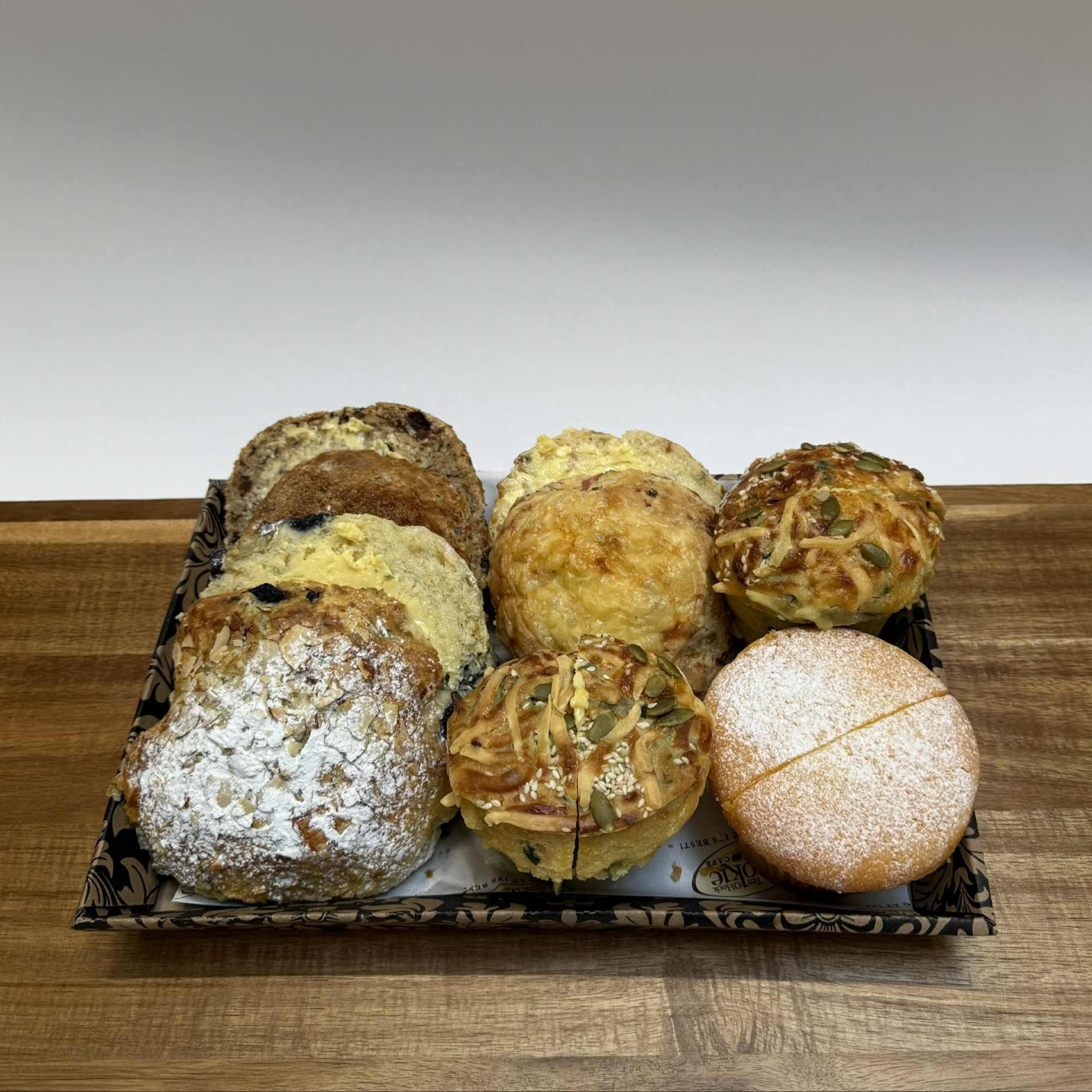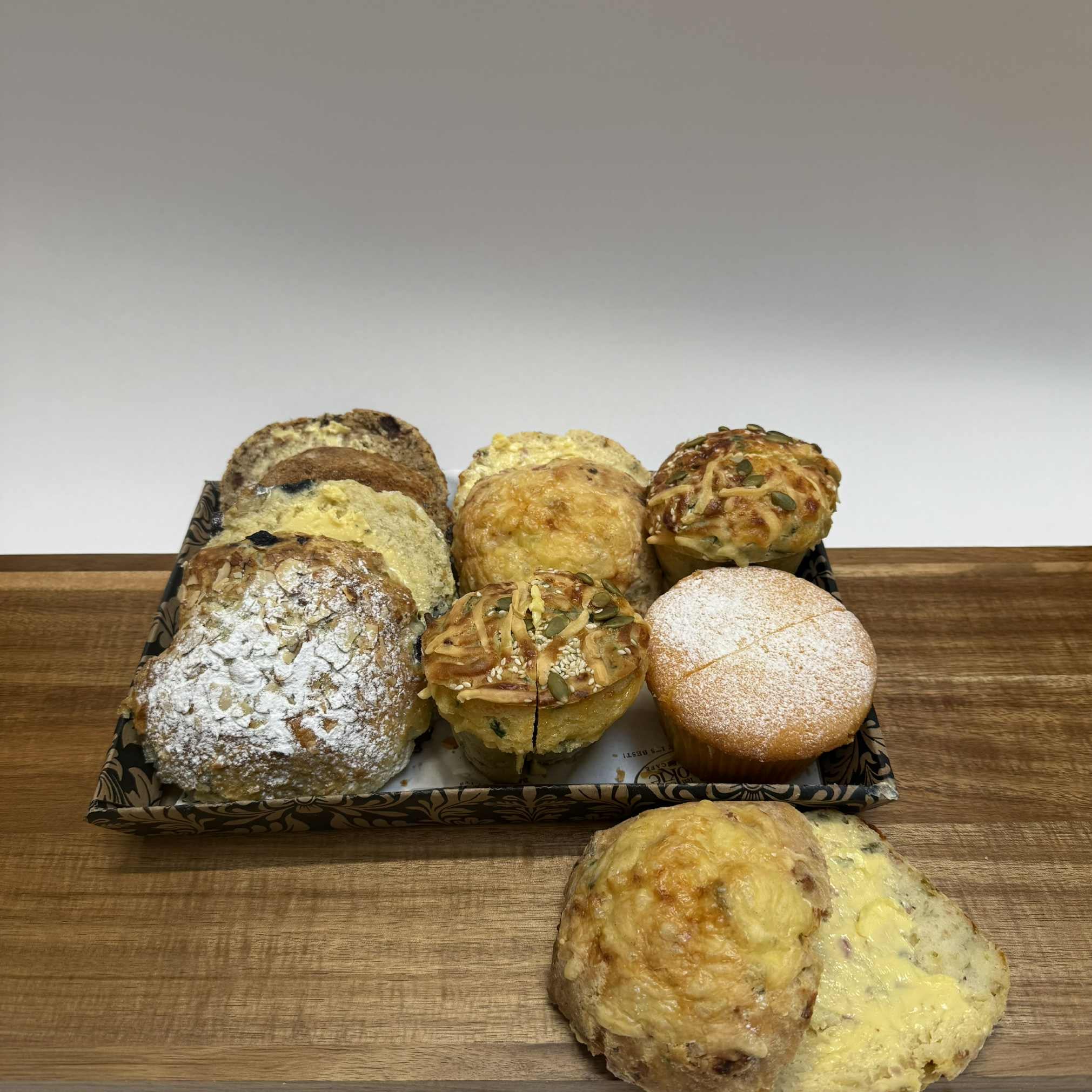 A delectable combination of savoury and sweet scones and muffins, ideal for business meetings, lunches and more.