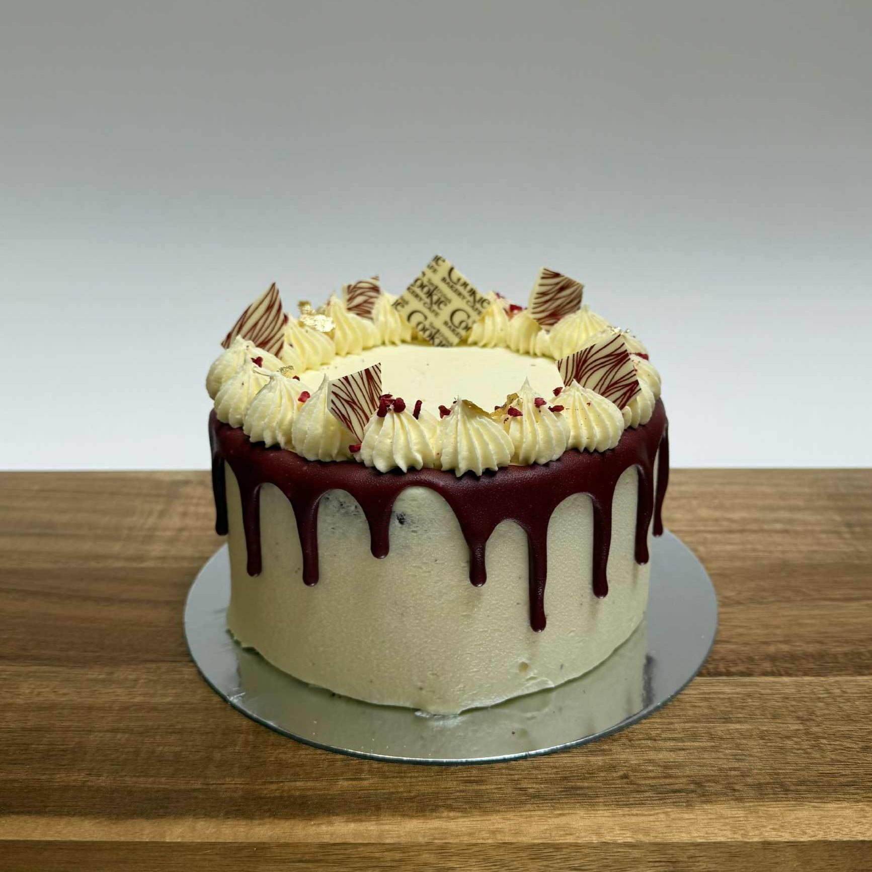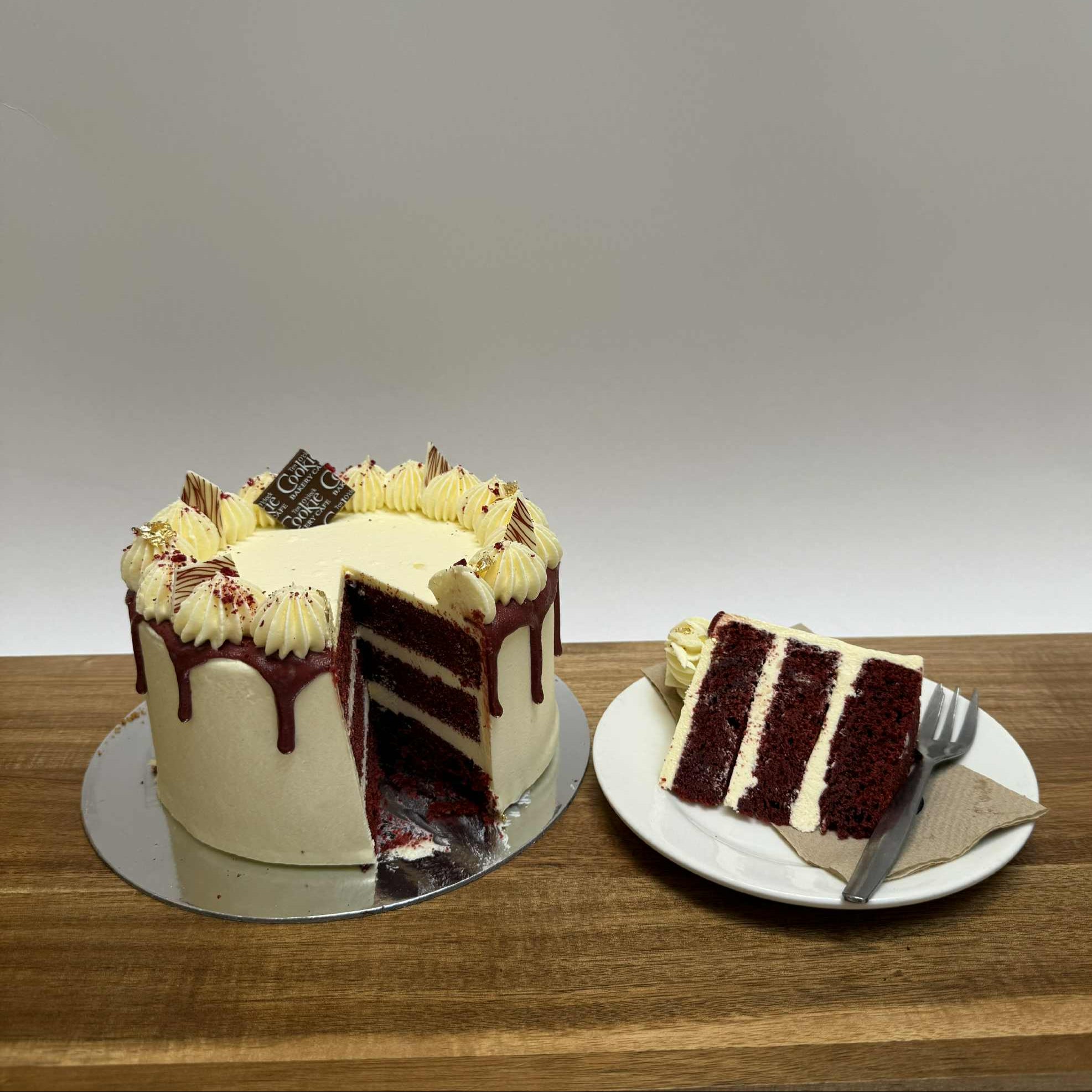 Our Vanilla Bean Red Velvet Cake is a delightful treat featuring moist red velvet layers infused with real vanilla bean. Each slice is generously layered with creamy cream cheese frosting and finished with a smooth red velvet ganache. Perfect for birthdays and special events, this cake brings a touch of elegance and indulgence to any celebration.