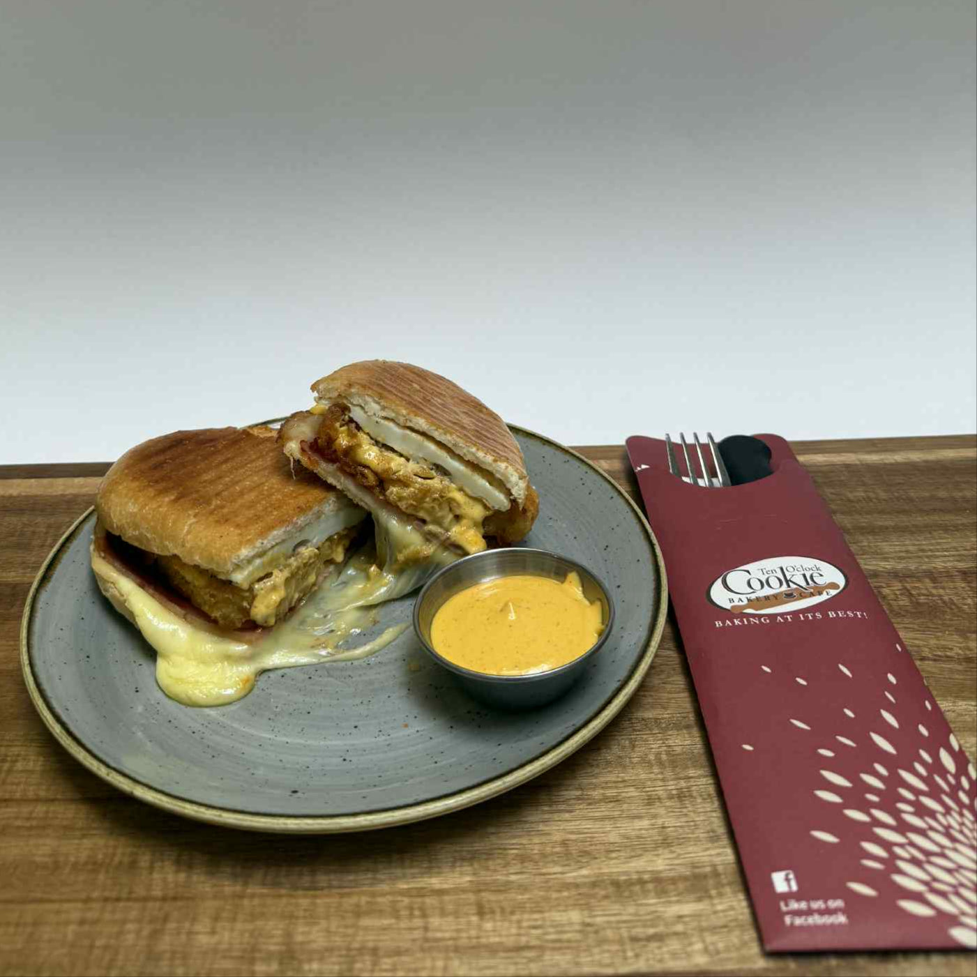 Bacon, hollandaise*, hashbrowns, a fried free-range egg, cheese and tomato relish fill a freshly baked panini in our store.