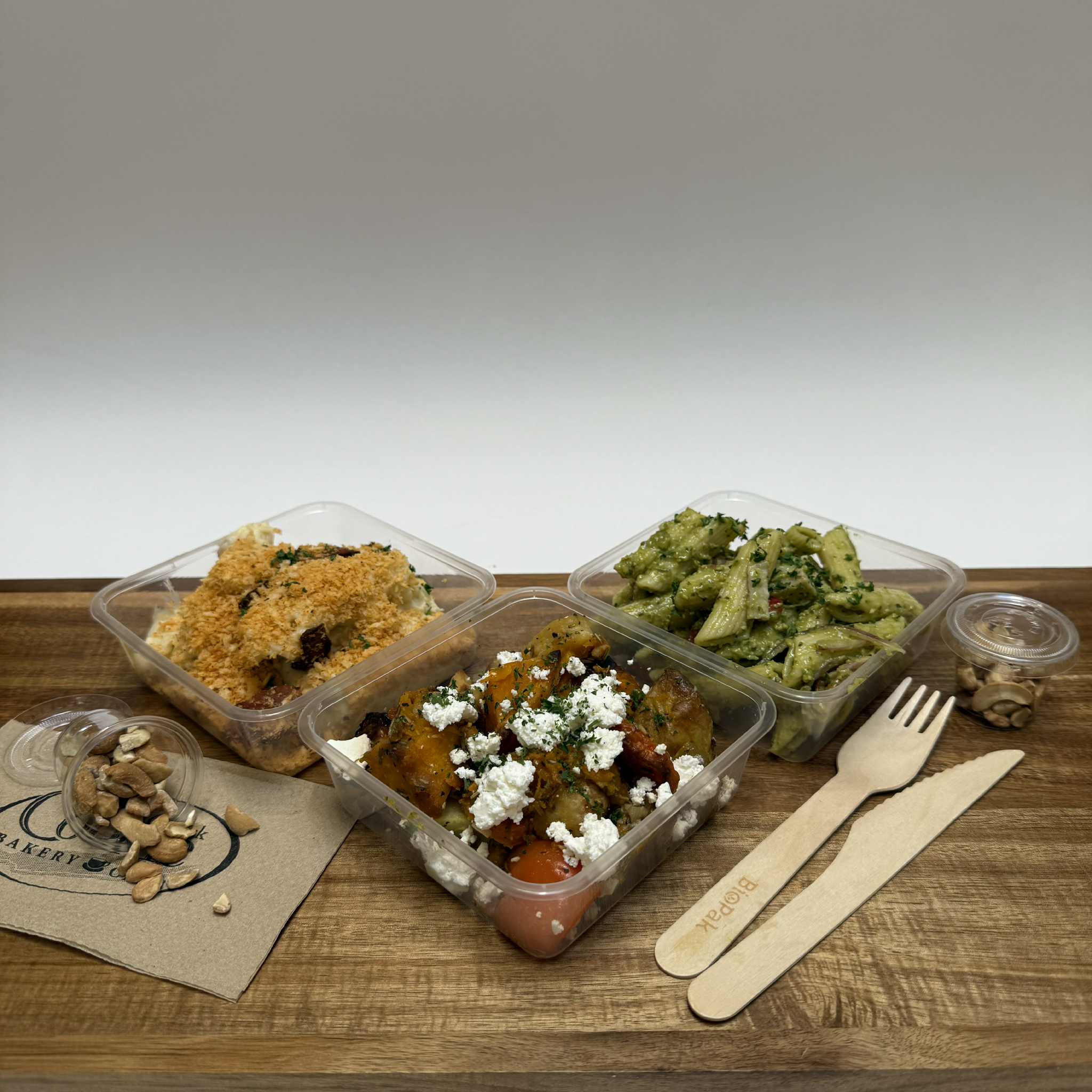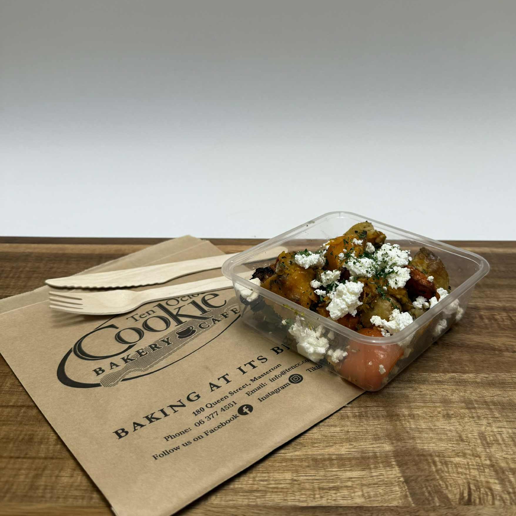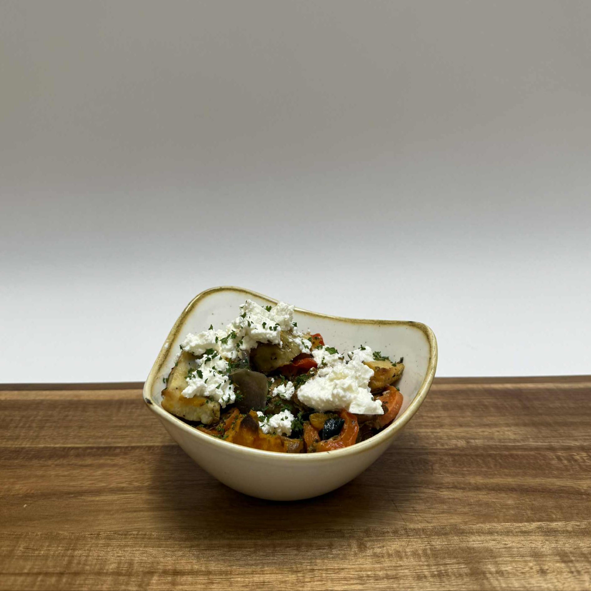 Potatoes, sweet potatoes, parsnips, carrots, pumpkins, bell peppers and red onions are evenly mixed with garlic, rosemary, and olive oil and finished with crumbled feta cheese, parsley, French dressing and a balsamic glaze. Optional cashew nuts add an extra crunch and flavour.