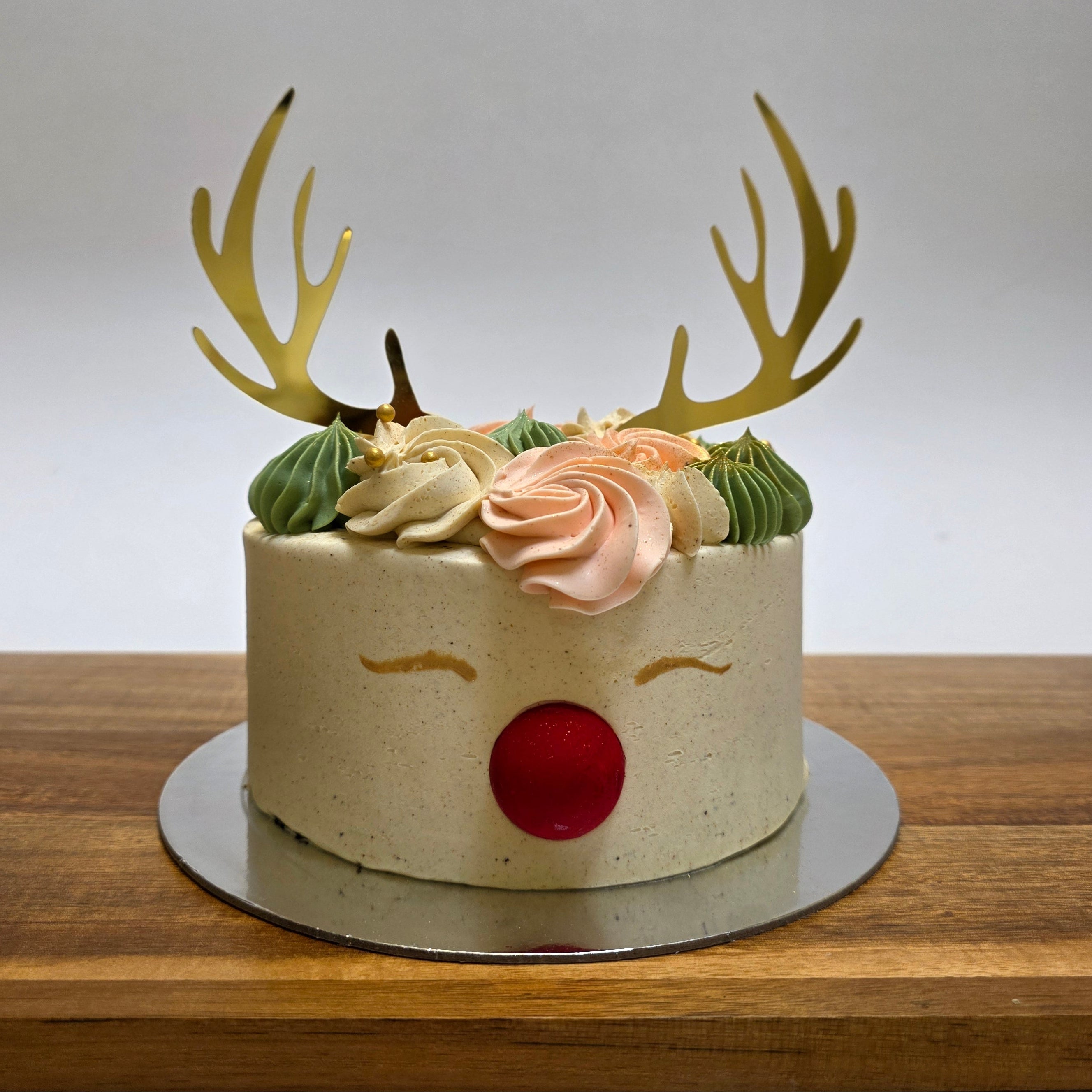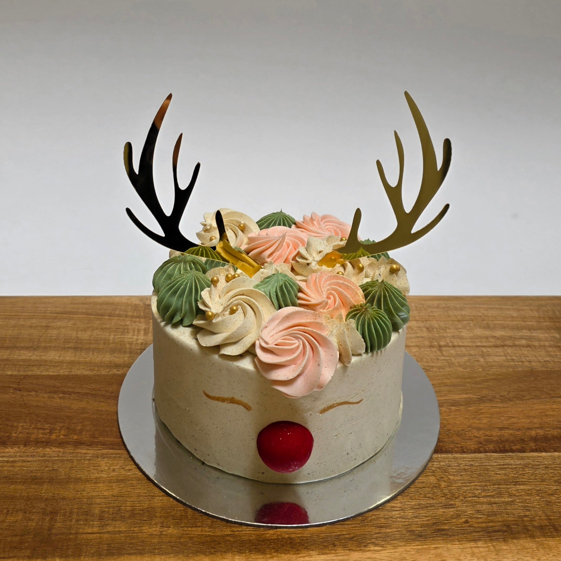 Our festive chocolate mud cake is a true holiday treat. Deep, decadent chocolate layers are paired with our smooth gingerbread frosting, adding a cosy blend of seasonal spices. Beautifully decorated with a playful reindeer design, this cake is made to impress and perfect for celebrating with family and friends.